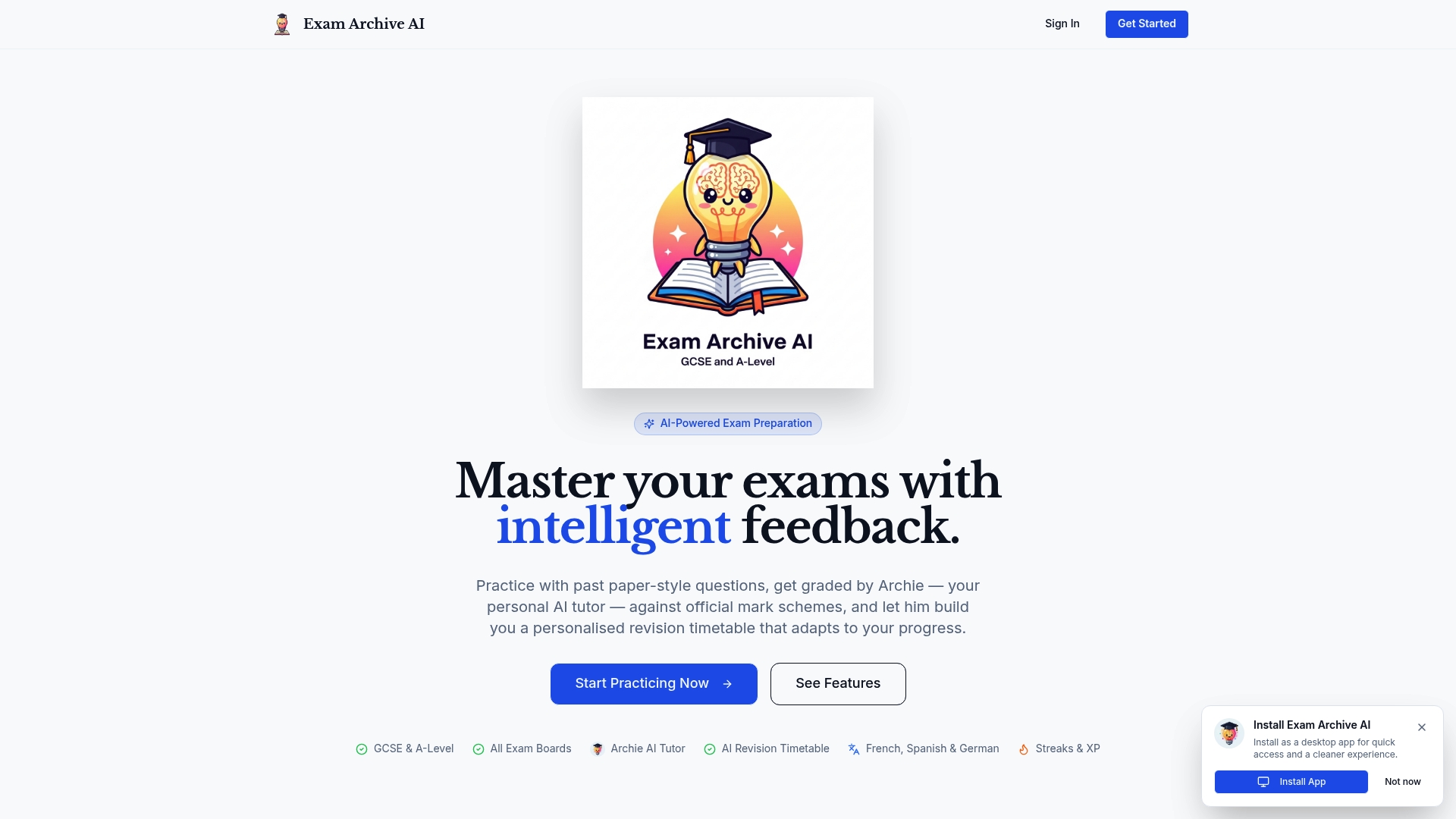Exam Archive AI offers an AI-powered platform specifically designed for GCSE and A-Level students to organise, track, and enhance their revision planning. The system generates practice questions modelled on official past papers, automatically grades your responses, and provides personalised feedback on exam technique through Archie, your AI tutor. This immediate feedback helps you identify knowledge gaps far more efficiently than self-marking.