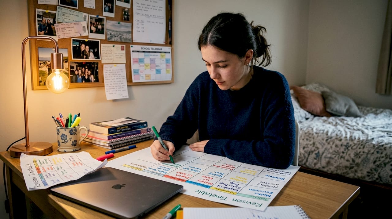 Step 1: Assess available time. Count the weeks between now and your first exam. Subtract any periods when you genuinely can't study, like family holidays or major school events. Be honest about how many hours per day you can realistically dedicate to revision whilst maintaining wellbeing. Most students can manage 3 to 4 hours of focused study on school days and 5 to 6 hours on weekends.